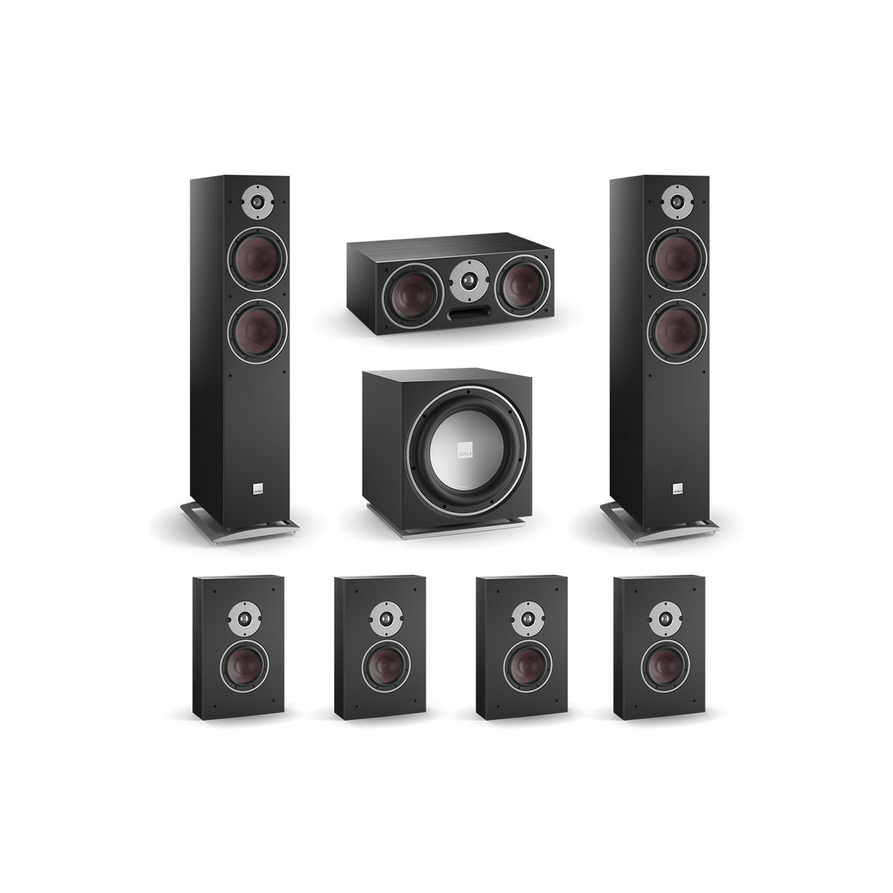 L'ensemble Dali Oberon 7 - 7.1 Surround en noir offre un son surround puissant et immersif, idéal pour le home cinéma avec des basses profondes et des aigus clairs.